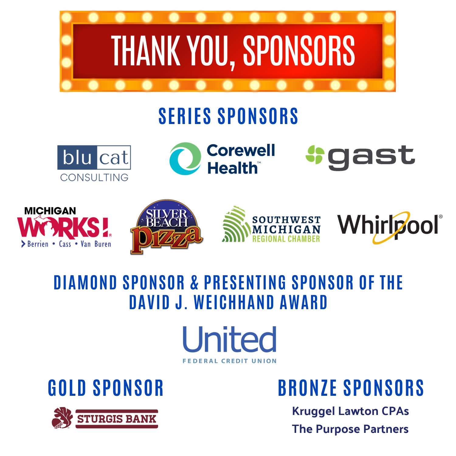 We also want to give a well-deserved shoutout to the sponsors making this night possible. Our Series sponsors: Whirlpool Corporation, Corewell Health, Michigan Works! Berrien, Cass, and Van Buren, Gast, Silver Beach Pizza, Southwest Michigan Regional Chamber, and BluCat Consulting. Our Diamond sponsor: United Federal Credit Union. Gold sponsor: Sturgis Bank. And Bronze sponsors: Kruggel Lawton CPAs and The Purpose Partners.